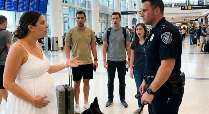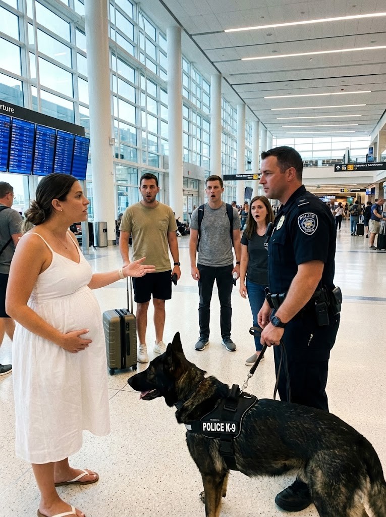 She stood halfway through the security gate—a tall blonde woman, one hand resting protectively over her swollen belly. Her movements were slow, careful. Her face drained of color as dozens of eyes turned toward her.