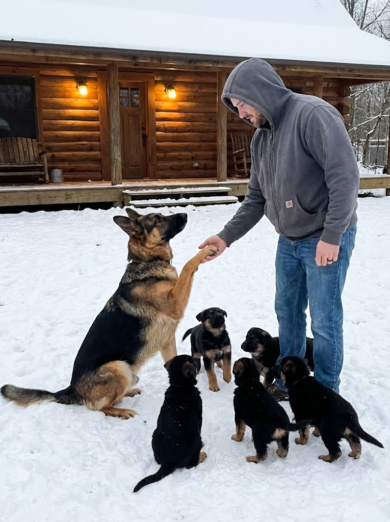 She stood over a shallow depression in the snow, her body curved protectively, legs trembling with the effort of staying upright. Rowan’s gaze dropped, following the line of her stance, and his breath caught. Four puppies lay beneath her, no more than two weeks old.
