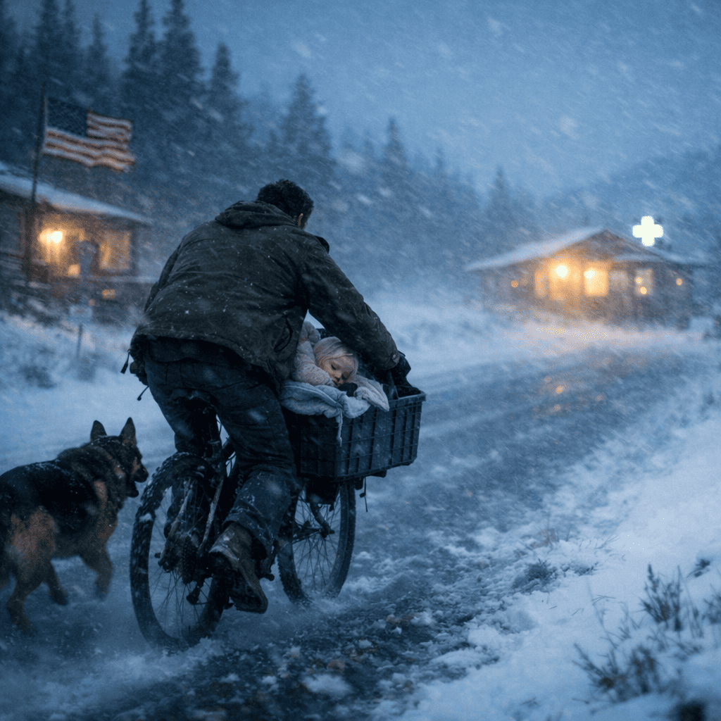 The ride to the clinic was eight miles of winding roads, frozen potholes, and near-zero visibility. The snow whipped sideways, slapping David’s face with every rotation of the wheels. His breath came out in heavy bursts, each cloud immediately caught by the wind and shattered. His gloved hands gripped the handlebars so tightly they went numb within minutes.