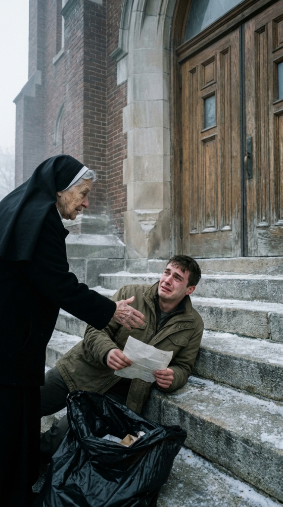 The nun—Sister Catherine, I’d learn later—walked down the steps slowly, her rosary beads clicking with each movement. She stopped two feet from me, studying my face with an intensity that made me want to disappear.