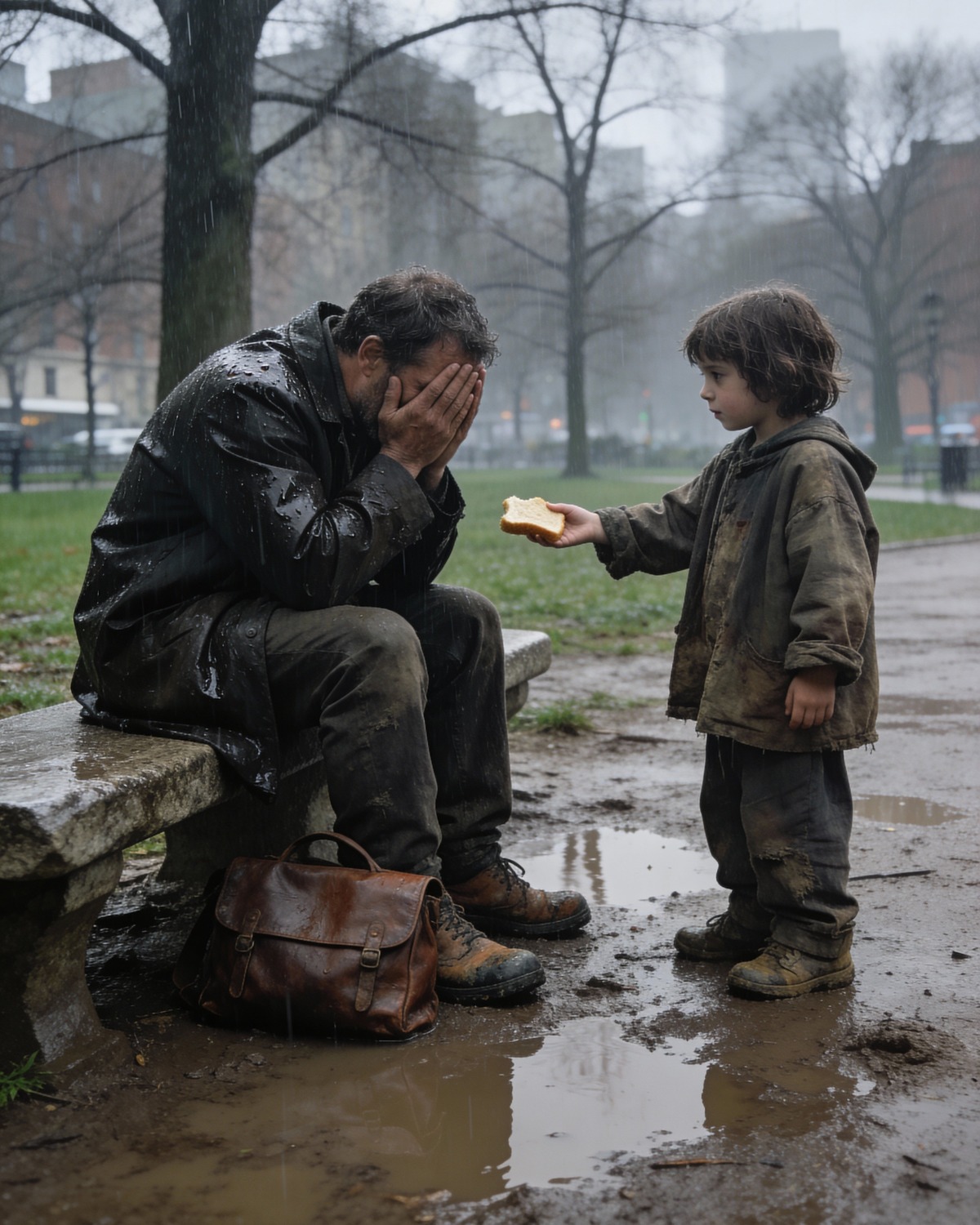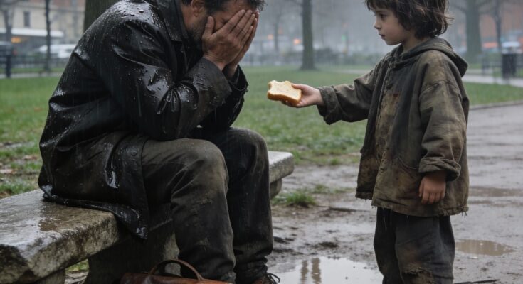 Jonathan looked down, startled, and found himself staring into a pair of wide brown eyes set in a face smudged with dirt but undeniably gentle. The girl could not have been older than six or seven. Her hair was tied into uneven pigtails, and she wore a sweater several sizes too large, its sleeves nearly covering her hands. In one of those hands, she held a piece of bread wrapped carefully in a napkin, already torn in half.