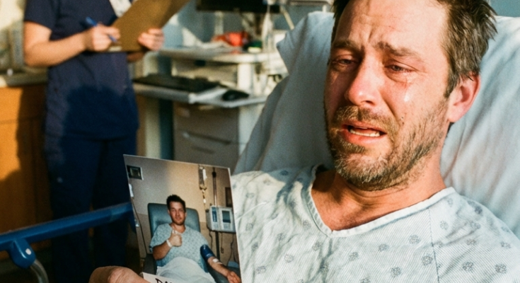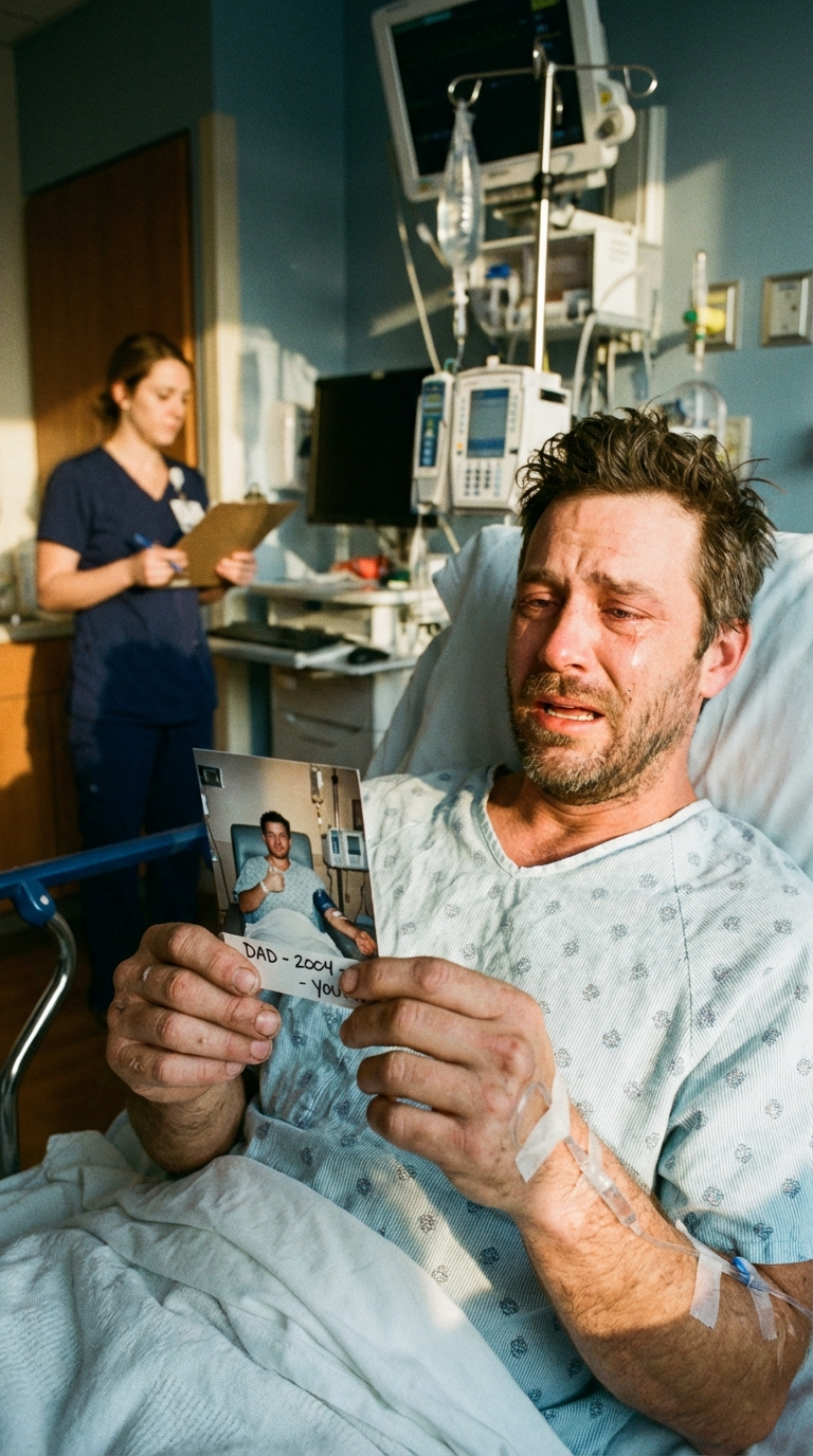 My hands trembled as I opened it. Inside was a single photograph, faded and worn like it had been carried in a wallet for years. It showed a young man, maybe twenty-seven, sitting in a hospital chair with an IV in his arm, giving a thumbs-up to the camera. He looked exhausted but grateful. His eyes were closed, but he was smiling. Alive.
