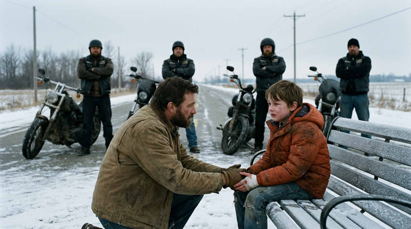 His name was Marcus. I found him on that desolate highway shoulder, hunched on a metal park bench, shaking like a leaf in the brutal winter wind. His orange jacket was filthy, streaked with mud and what looked like oil stains. His jeans were torn at the knees, and his left hand was wrapped in what I eventually realized was a ripped T-shirt, the fabric soaked through with blood that had turned dark brown in the cold. He was crying—not the loud, dramatic sobs of a child throwing a tantrum, but the kind of silent tears that tell you a kid has cried so much, for so long, that he doesn’t have the energy left to make noise.
