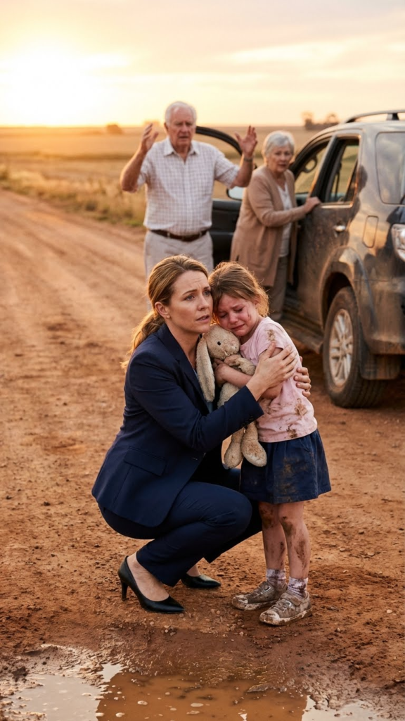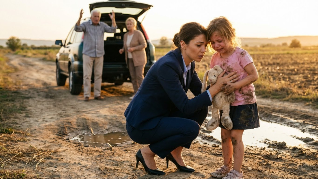 She couldn’t speak. She just buried her face in my shoulder and cried harder, her whole body shaking with sobs that felt too big for someone so small. Her clothes were soaked through—not just damp, but completely saturated. Her hair smelled like old sweat and something else—something sour that made my stomach turn. The mud on her skirt was dried and cracking in places, which meant it had been there for hours. Not minutes. Hours.