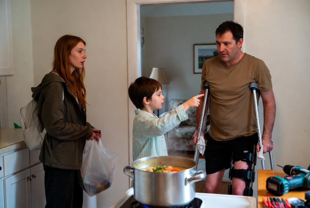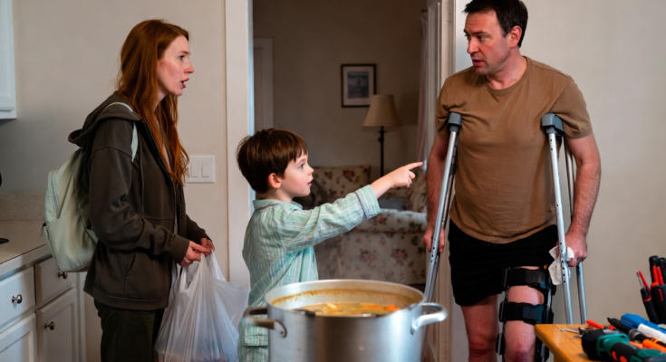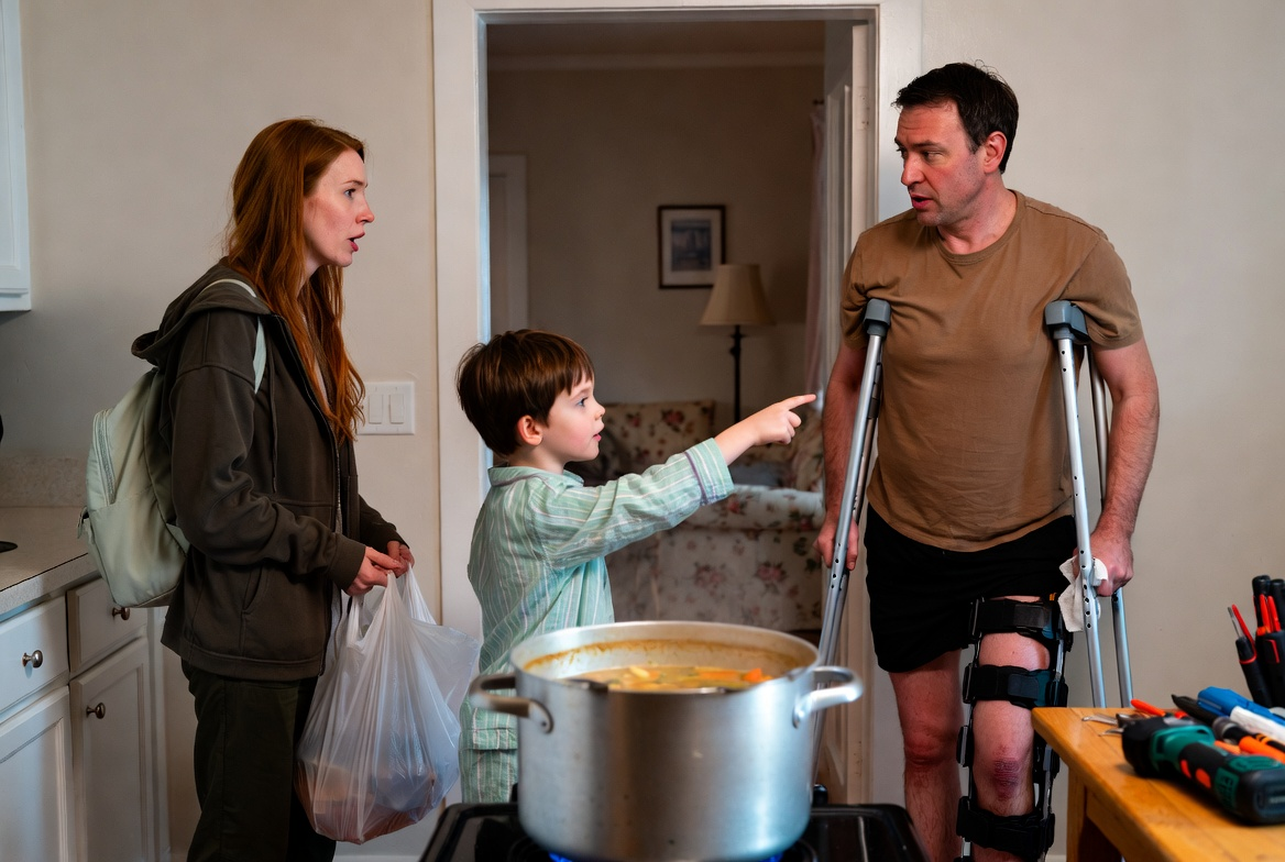 A tall man turned slowly from the stove, steadying himself with a medical brace secured around his knee. For a breathless second, my mind refused to connect the stranger with the quiet domestic scene unfolding before me.