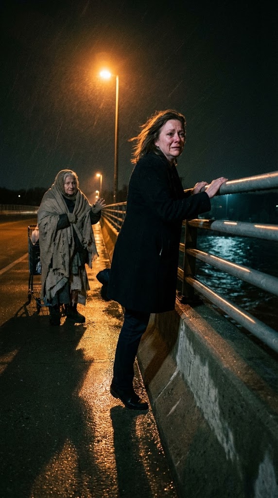 I turned my head slightly. A homeless woman stood about ten feet away, wrapped in layers of stained blankets and torn jackets. Her shopping cart was parked under the bridge’s overhang. She was old—maybe seventy—with matted gray hair and a face carved with wrinkles that spoke of a hard life.