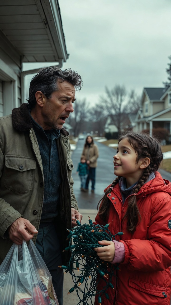 I turned. She couldn’t have been more than seven years old, wearing a too-big winter coat that probably used to belong to someone else, holding a tangled string of Christmas lights that dragged on the ground. Behind her stood a woman I vaguely recognized—my new neighbor from across the street. The one who’d moved in two months ago with three kids and moving boxes labeled in neat handwriting. The one I’d waved to exactly once and then promptly ignored.