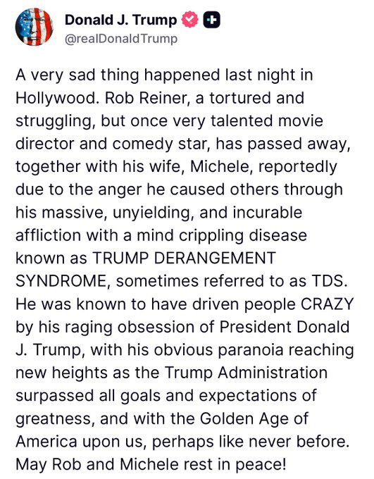 “A very sad thing happened last night in Hollywood. Rob Reiner, a tortured and struggling, but once very talented movie director and comedy star, has passed away, together with his wife, Michele, reportedly due to the anger he caused others through his massive, unyielding, and incurable affliction with a mind crippling disease known as TRUMP DERANGEMENT SYNDROME, sometimes referred to as TDS,” Trump wrote in part.
