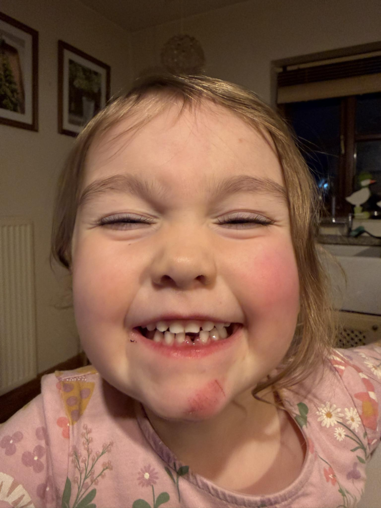 Ein kleines Mädchen zeigt voller Freude ihren ersten Wackelzahn.