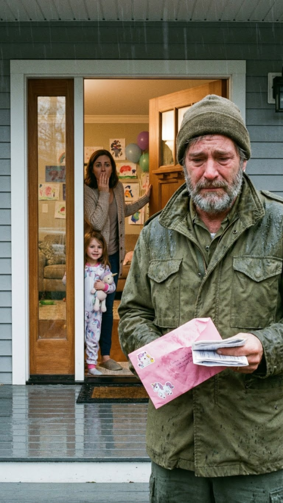 And now he was here, on our front porch, water pooling at his feet, holding Lily’s pink unicorn envelope like it was the most precious thing in the world.
