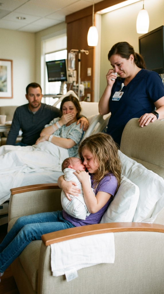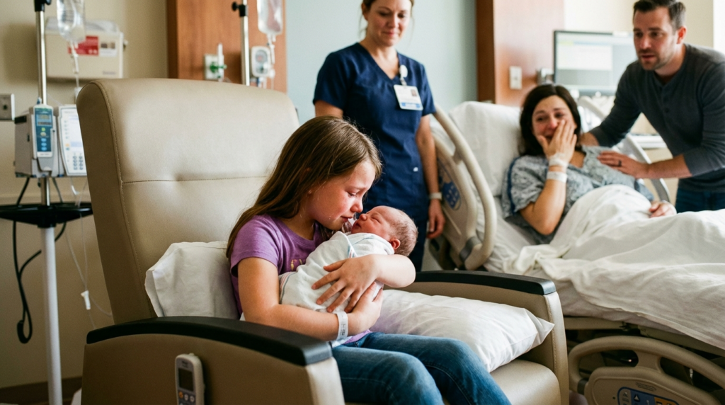 Nurse Jennifer looked concerned but nodded. She carefully brought my son over—all eight pounds, two ounces of him, wrapped snugly in the standard hospital blanket with the pink and blue stripes. She positioned Emma in the large chair beside my bed, arranging pillows to support her arms, then gently, carefully placed my newborn son into his big sister’s trembling hands.