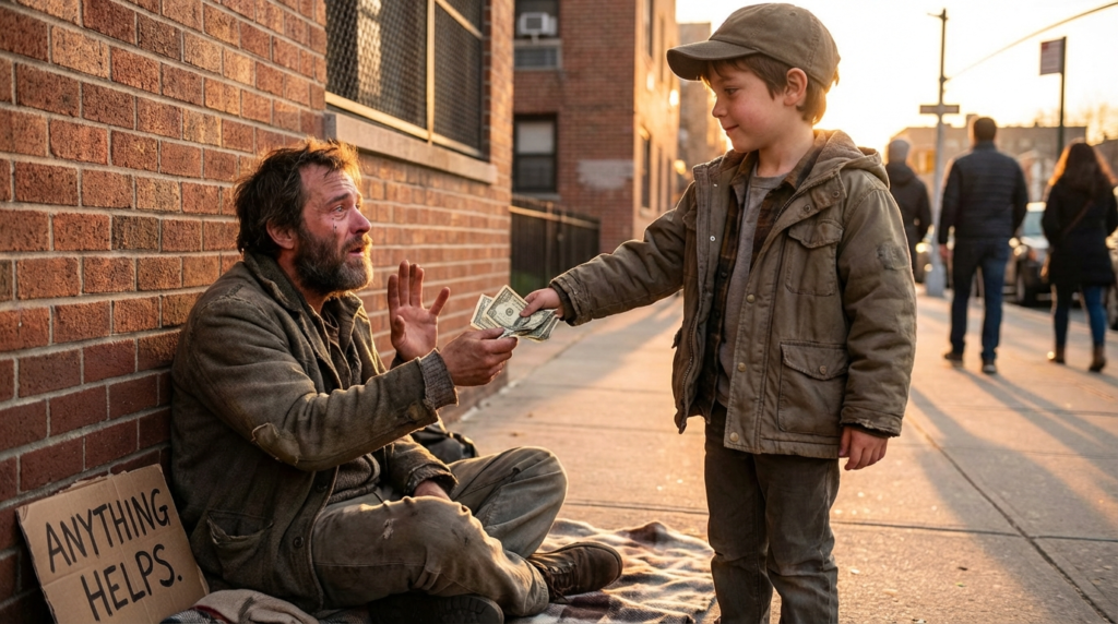Robert stepped forward, holding out a crumpled envelope. “I need you to take this back. I can’t… I can’t take money from a child. But he wouldn’t listen when I tried to tell him, and he ran off before I could—” He stopped, his voice breaking. “I’ve been sleeping rough for eight months. Since I lost my job and my apartment. But I’m not… I wouldn’t take money from a kid. Please.”