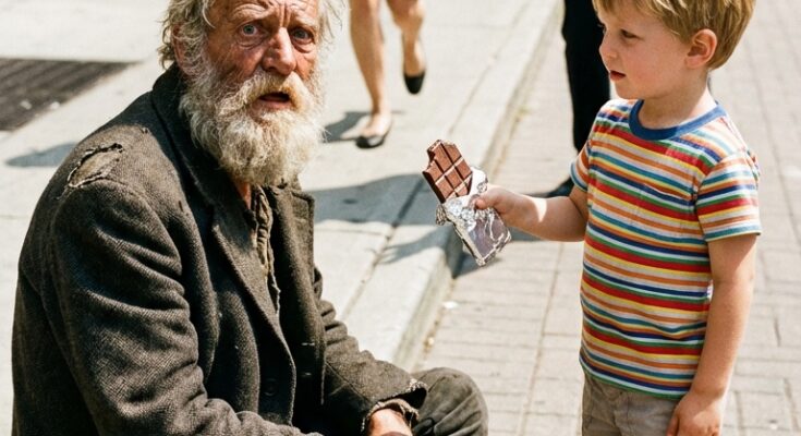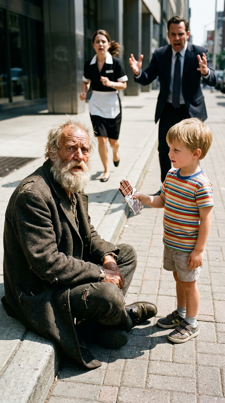 But Leo didn’t flinch. He reached into his pocket, pulled out his melting chocolate bar, and held it out. Then he said the word that stopped the entire busy street cold.