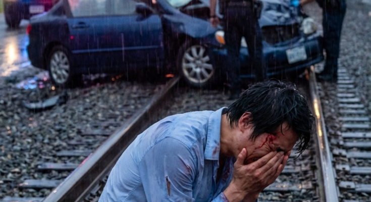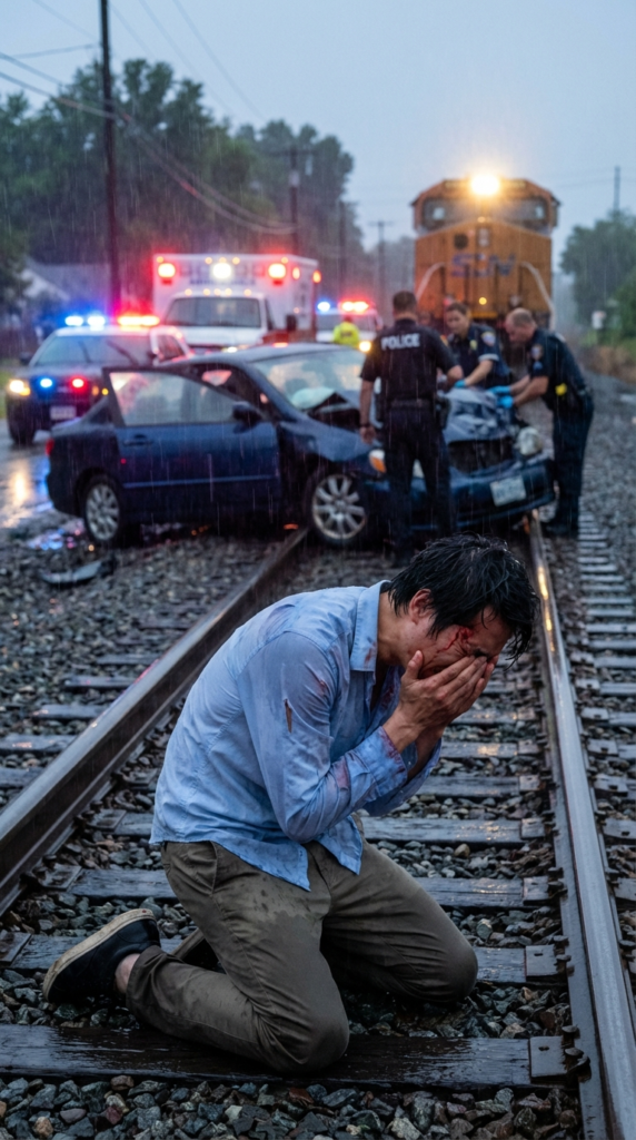 I turned. The car bounced over the service road’s rough pavement. Trees lined both sides, blocking visibility. Then suddenly—train tracks. Barricades visible too late. Warning lights obscured by a construction crane.