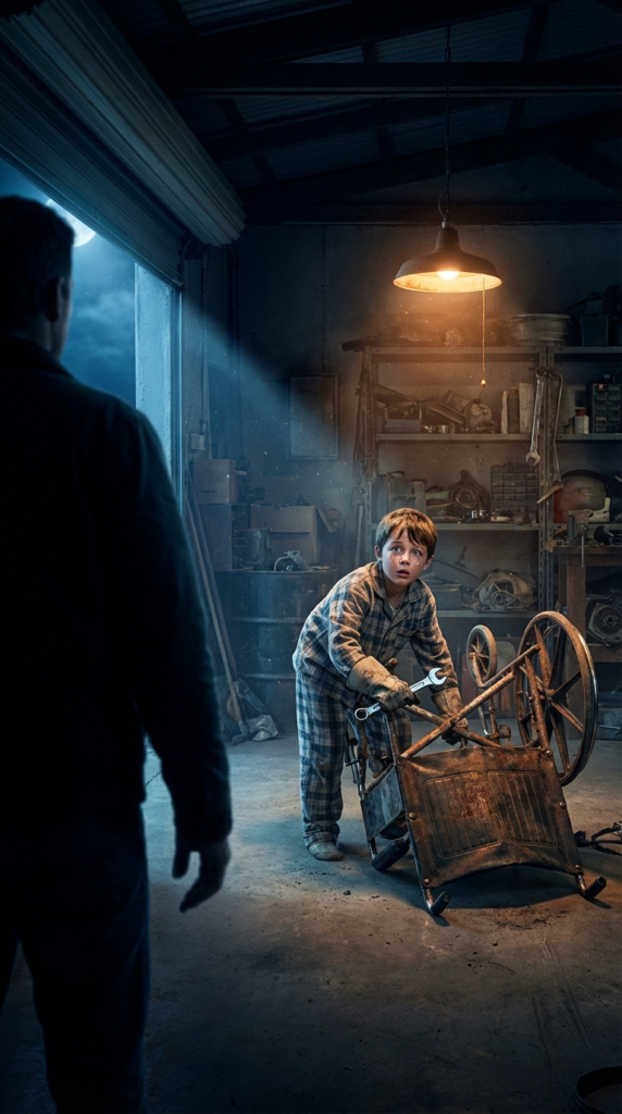 He wasn’t near the Mustang. He wasn’t near the tool chest. He was huddled on the greasy concrete floor near my workbench, under the harsh hum of the fluorescent tube.