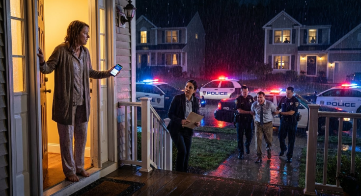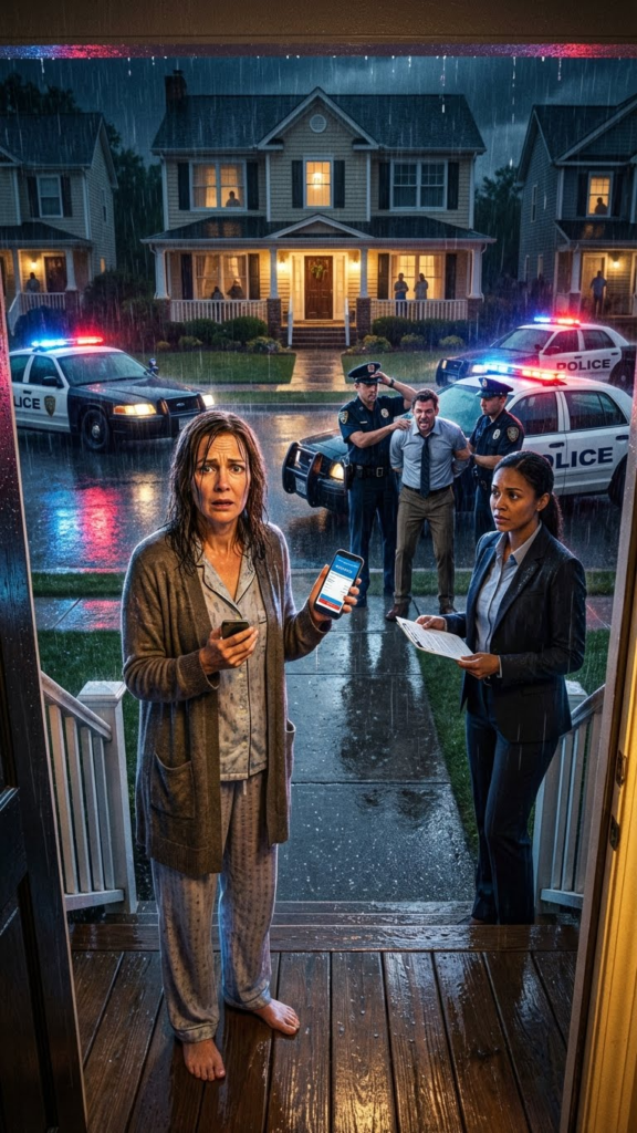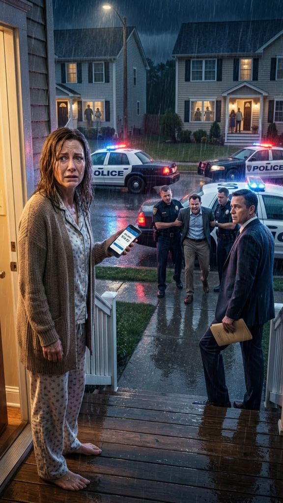 They drove away with Mark in the back seat, his face visible through the rain-streaked window, twisted with an rage I’d never seen before. I stood in the doorway as the taillights disappeared, neighbors still watching, rain soaking through my cardigan, phone clutched in my hand.