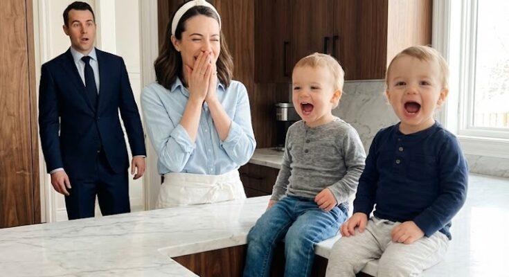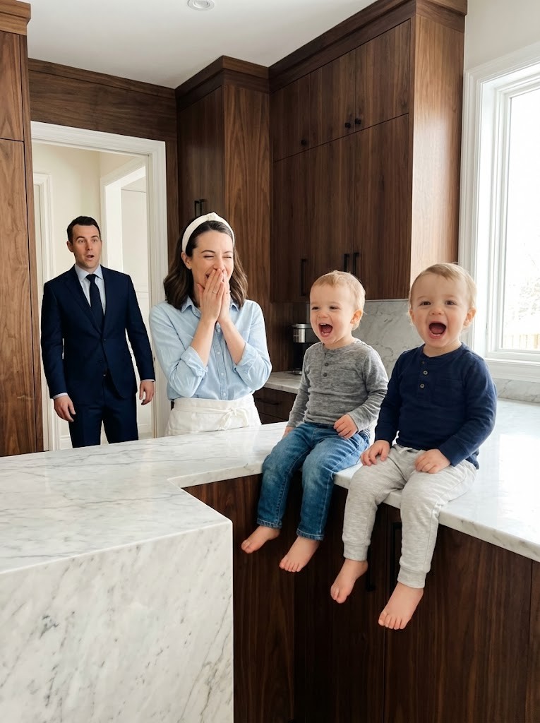 Lila had lifted Owen and Parker onto the wide granite island, ensuring that the surface was secure and steady, and she held them firmly at the waist while they stood upright, their small faces set with concentration. The morning sun streamed through the tall windows, casting a soft glow that made dust motes shimmer in the air as though the room itself were holding its breath.
