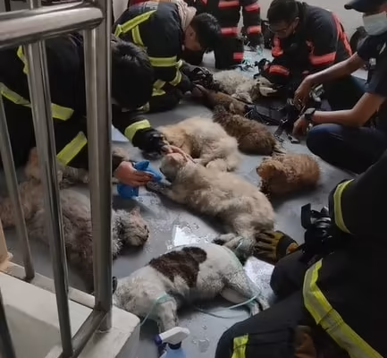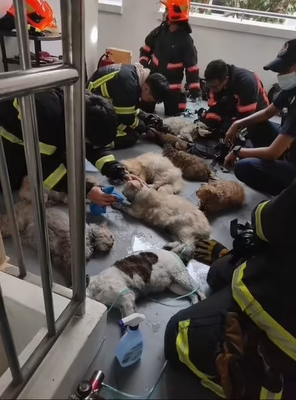 As the building burned and thick smoke filled the halls, several firefighters rushed inside to save not only the people trapped inside, but also the frightened pets left behind. They carried out cats, dogs, and even tiny turtles, doing everything possible to keep them alive.